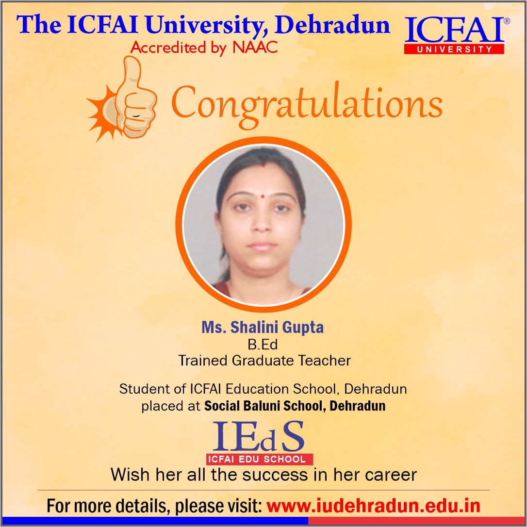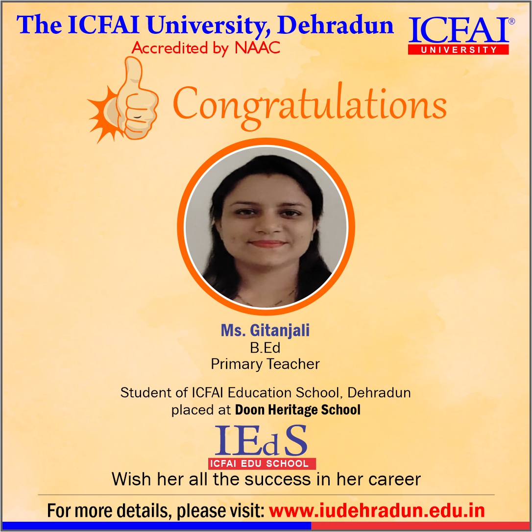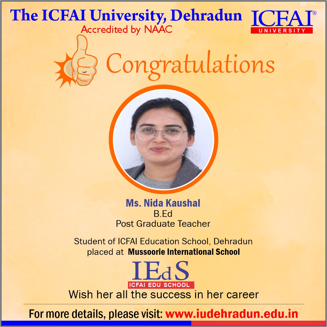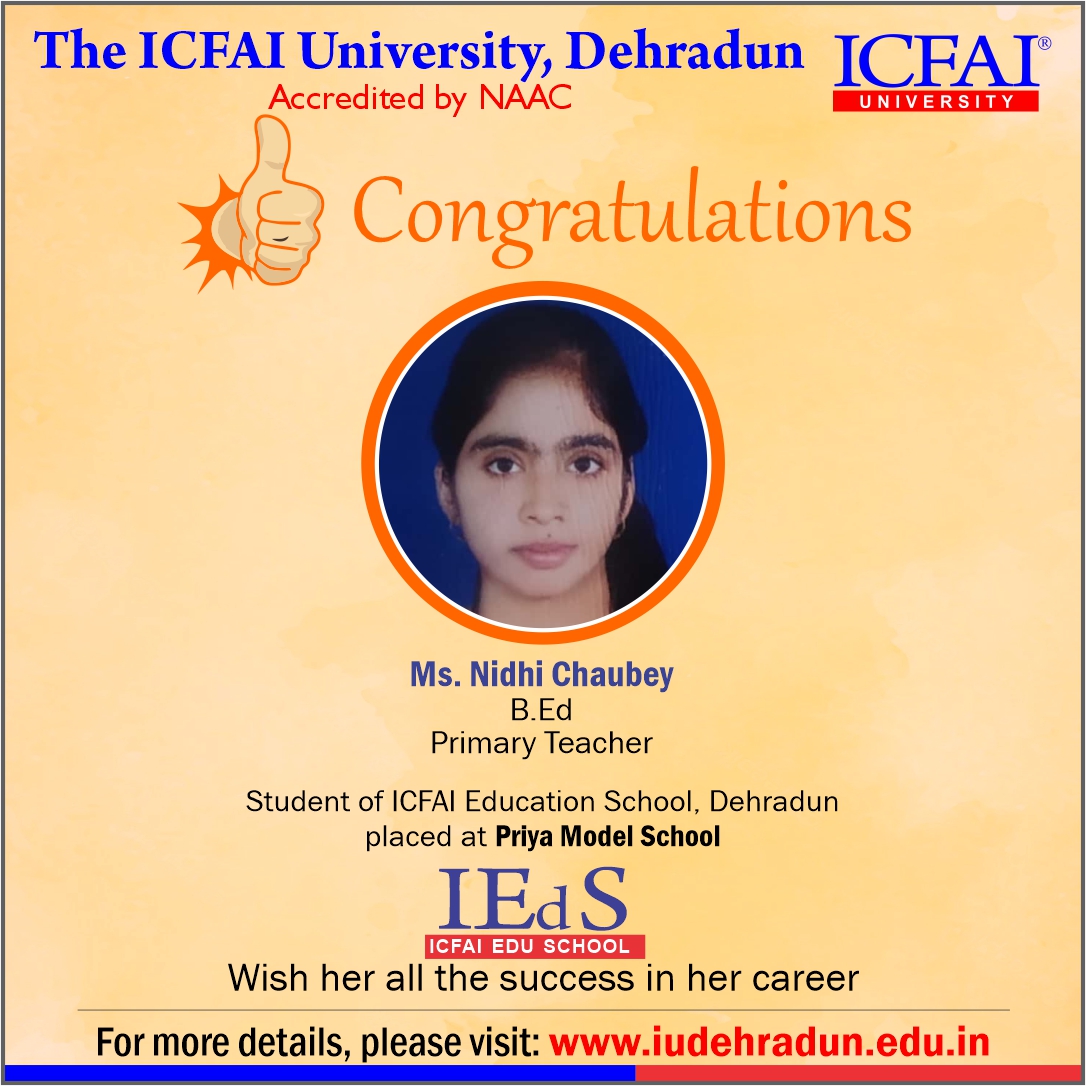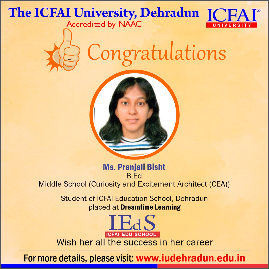 ICFAI Education School has made a strong network with the topmost schools with its unique and highly-appreciated curriculum and high rankings in several annual surveys. The 100% placement track placement record is the testimony to the high demand of IUD B.Ed. graduates in the education sector. From Delhi Public School to DAV, FoE graduates have proved to be the recruiter’s favorites even across the state of Uttarakhand.