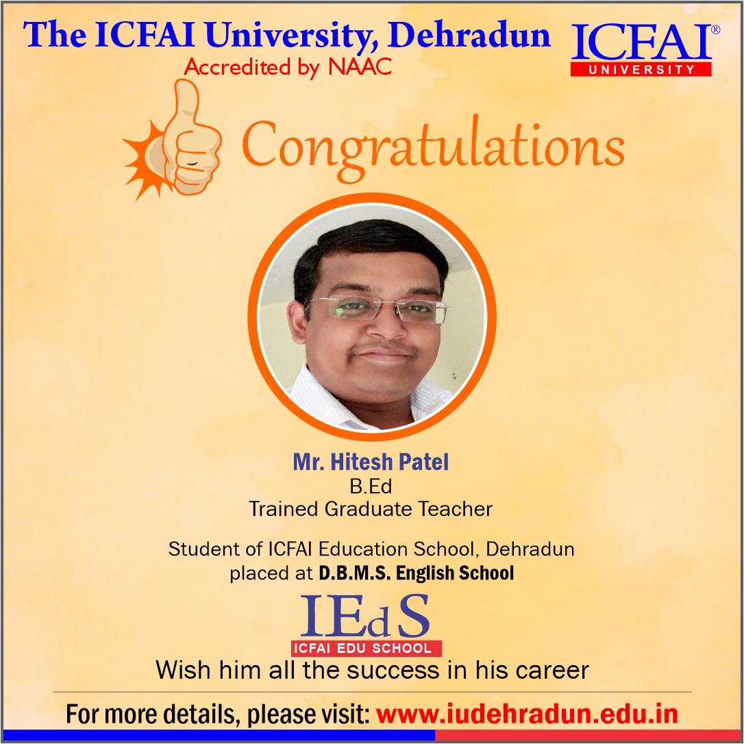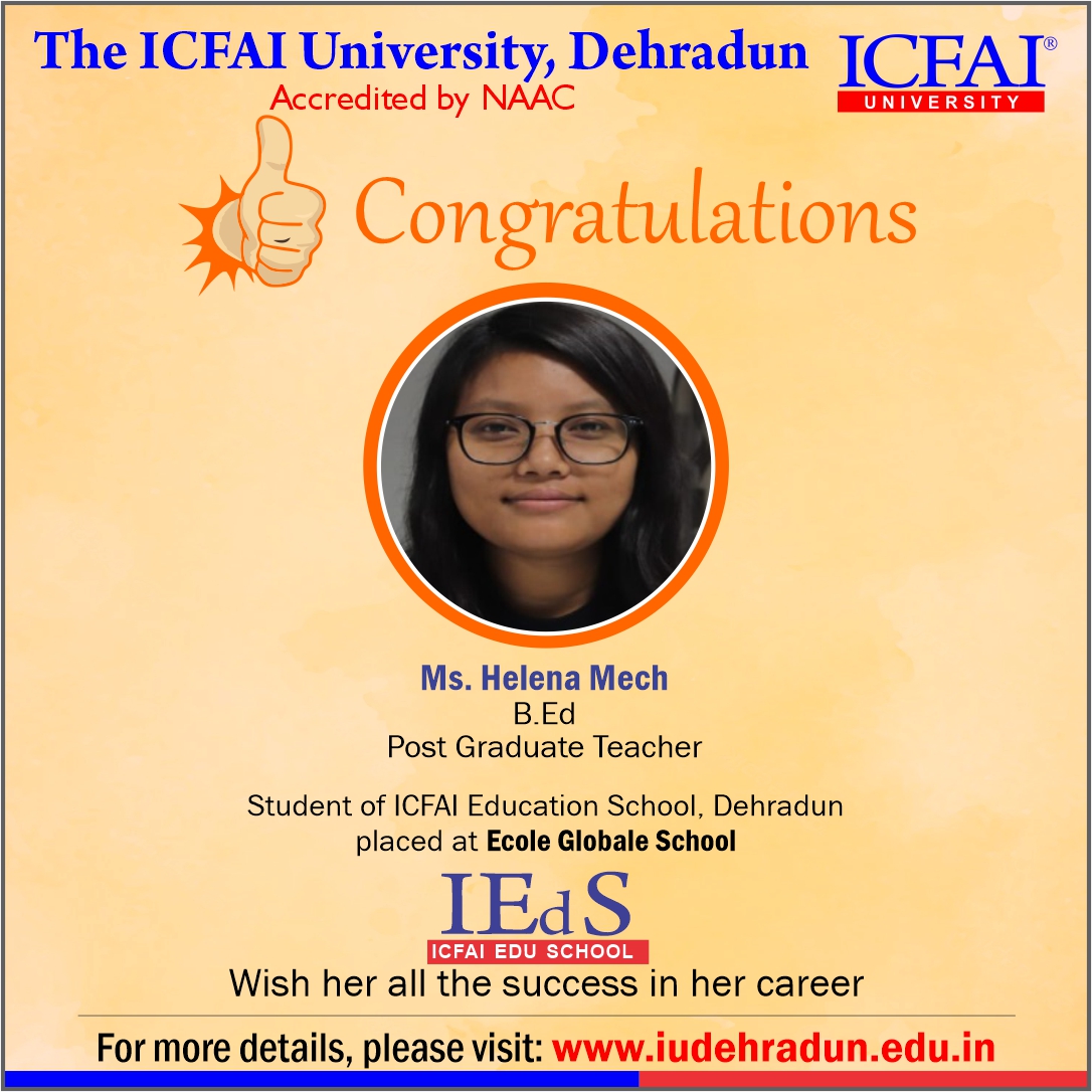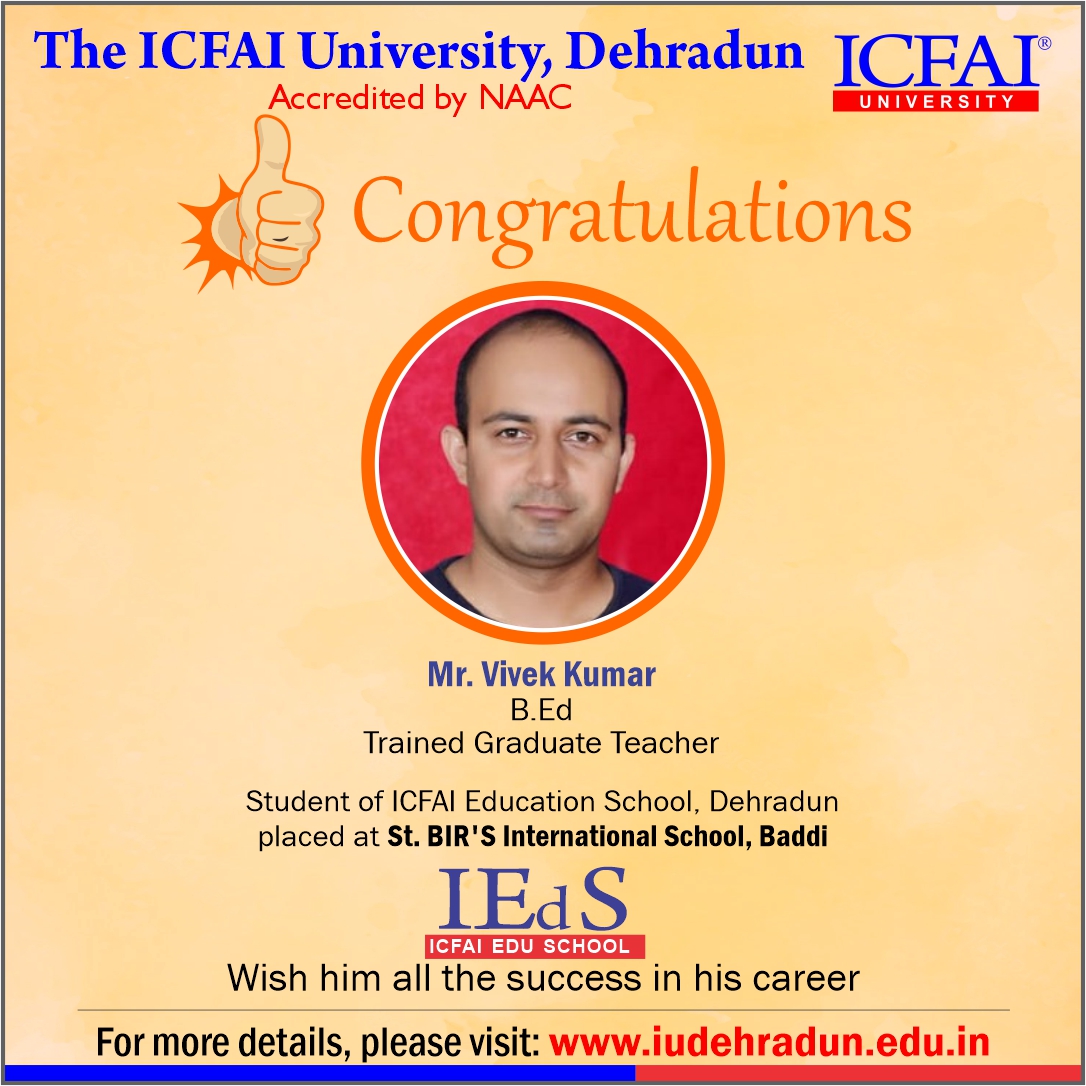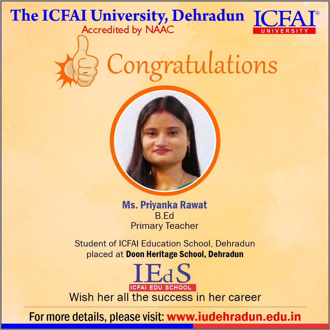 ICFAI Education School has made a strong network with the topmost schools with its unique and highly-appreciated curriculum and high rankings in several annual surveys. The 100% placement track placement record is the testimony to the high demand of IUD B.Ed. graduates in the education sector. From Delhi Public School to DAV, FoE graduates have proved to be the recruiter’s favorites even across the state of Uttarakhand.