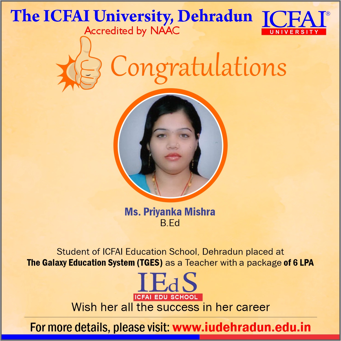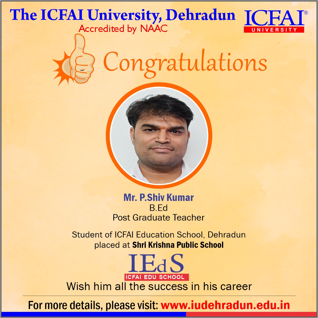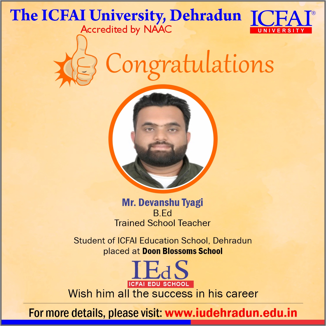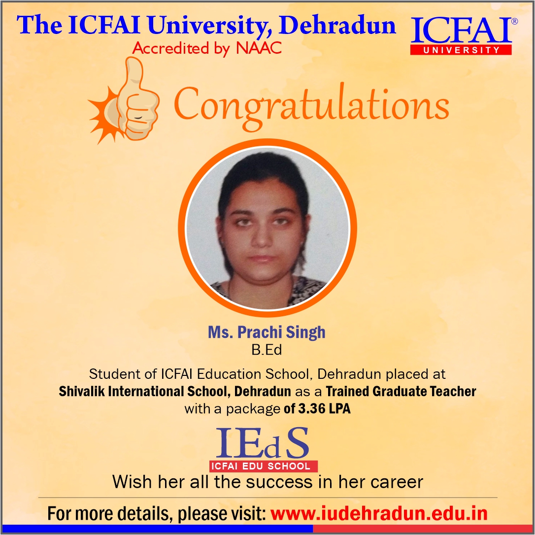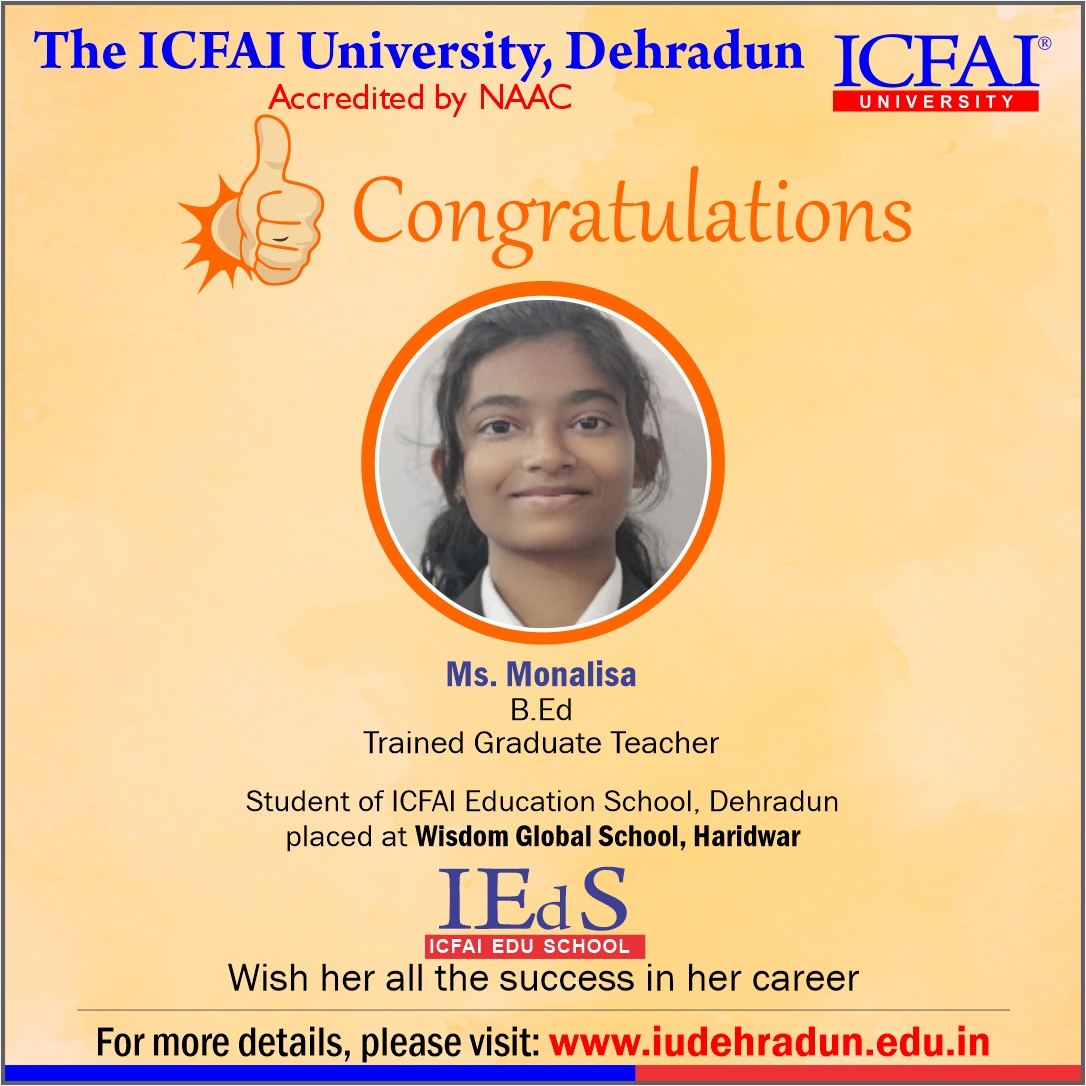 ICFAI Education School has made a strong network with the topmost schools with its unique and highly-appreciated curriculum and high rankings in several annual surveys. The 100% placement track placement record is the testimony to the high demand of IUD B.Ed. graduates in the education sector. From Delhi Public School to DAV, FoE graduates have proved to be the recruiter’s favorites even across the state of Uttarakhand.