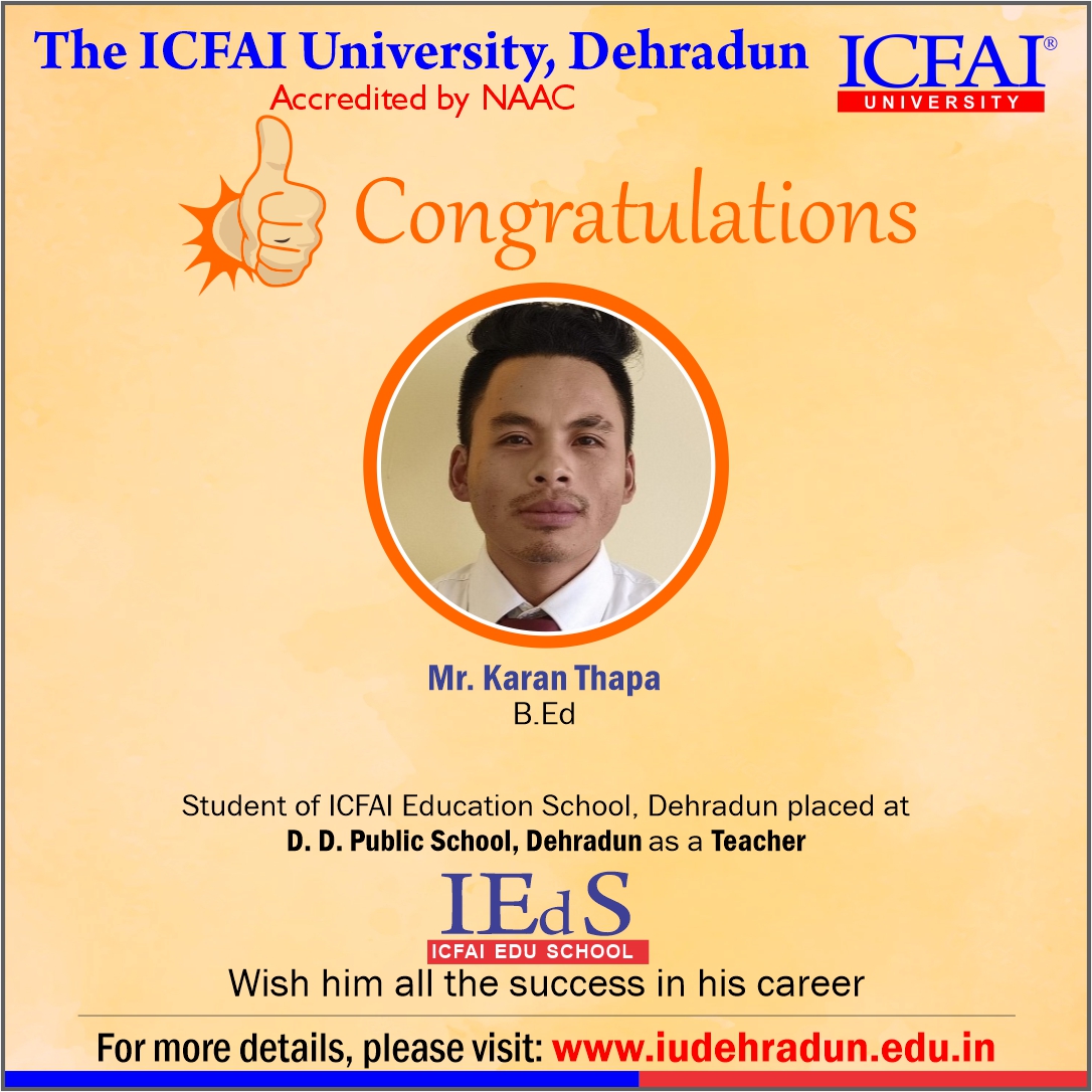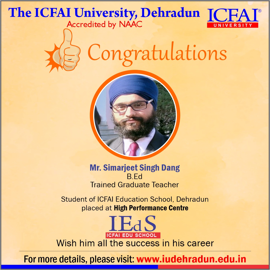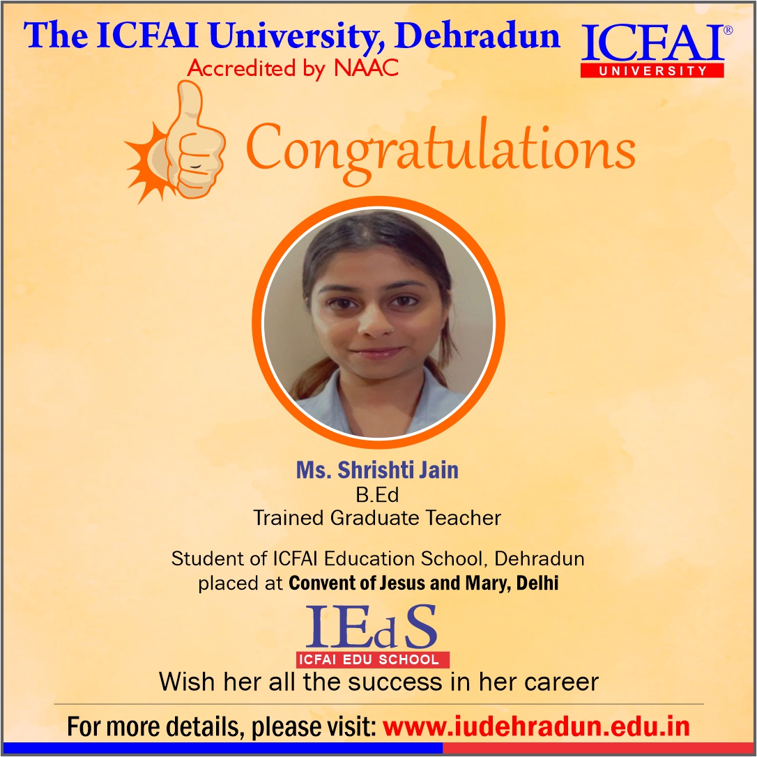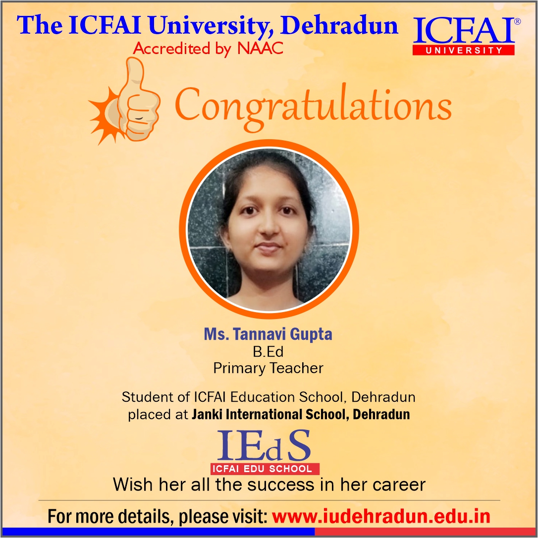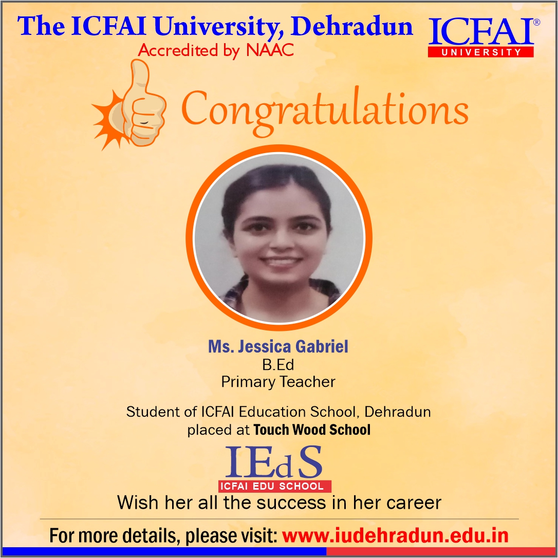 Faculty of Education, ICFAI University, Dehradun has made a strong network with the topmost schools with its unique and highly-appreciated curriculum and high rankings in several annual surveys. The 100% placement track placement record is the testimony to the high demand of IUD B.Ed. graduates in the education sector. From Delhi Public School to DAV, FoE graduates have proved to be the recruiter’s favorites even across the state of Uttarakhand.