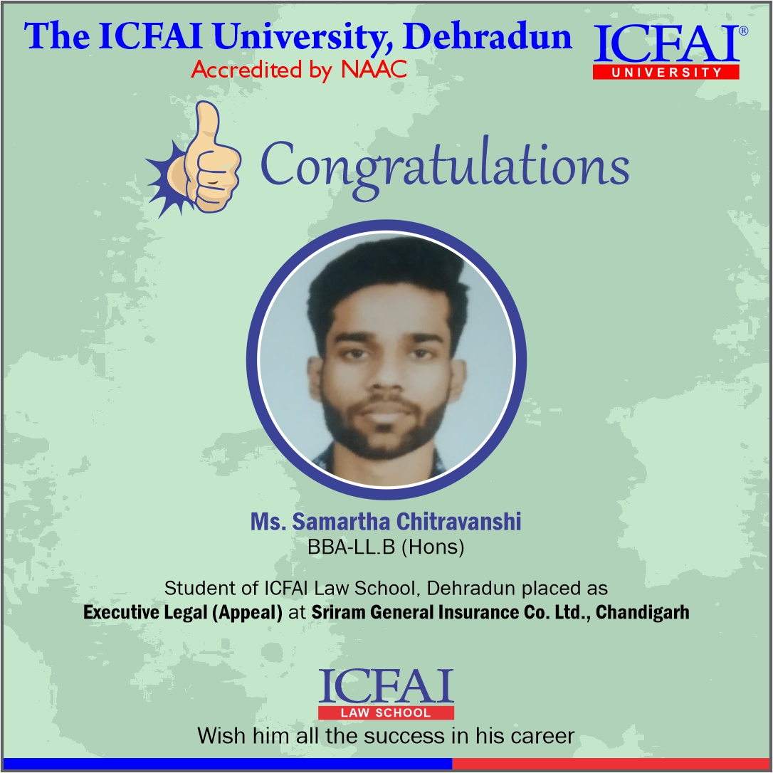 | 9 | 20FLICDDN01033 | SAMARTHA CHITRAVANSHI | BBA-LL.B (Hons.) | 2020 - 25 | Shri Ram Genral Insurance Co.Ltd | ![]() |