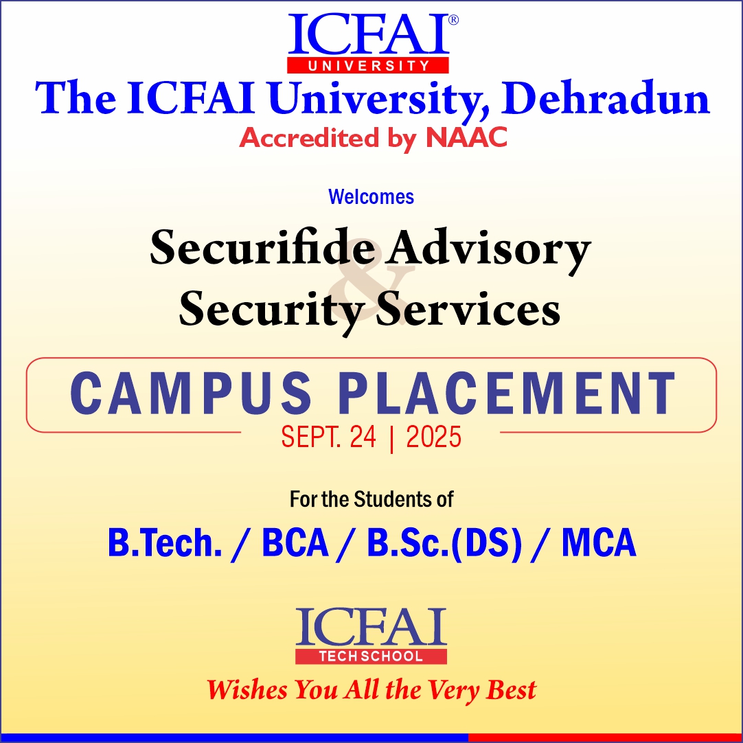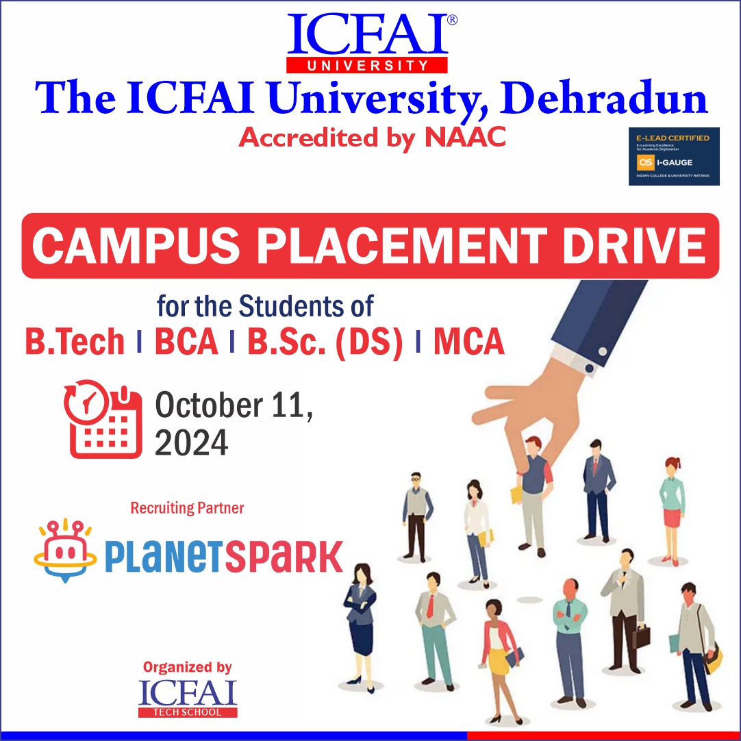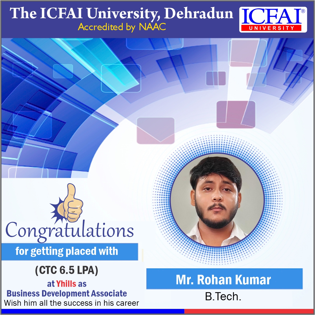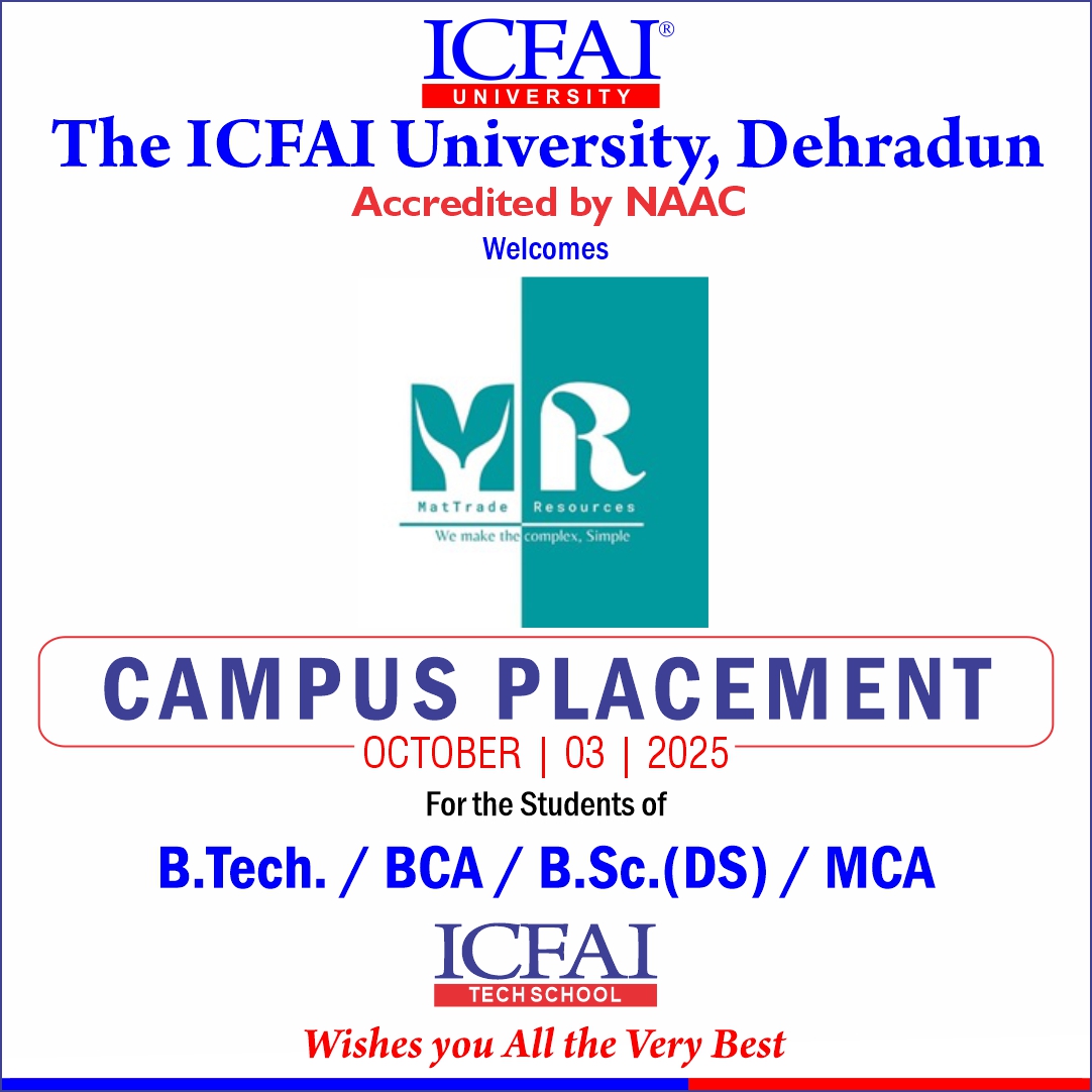 - At The ICFAI University, Dehradun, our dedicated Placement Department works tirelessly throughout the year to ensure students receive top-notch placement support. But it doesn't stop there - we go beyond the classroom with expert-led Guest Lectures and insightful Industrial Tours, giving students real-world exposure and the confidence to thrive in today's competitive world.