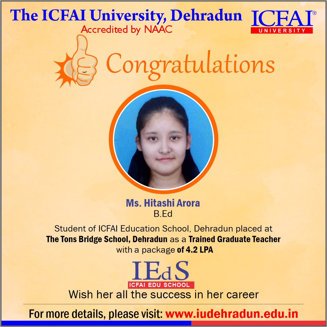 Faculty of Education, ICFAI University, Dehradun has made a strong network with the topmost schools with its unique and highly-appreciated curriculum and high rankings in several annual surveys. The 100% placement track placement record is the testimony to the high demand of IUD B.Ed. graduates in the education sector. From Delhi Public School to DAV, FoE graduates have proved to be the recruiter’s favorites even across the state of Uttarakhand.