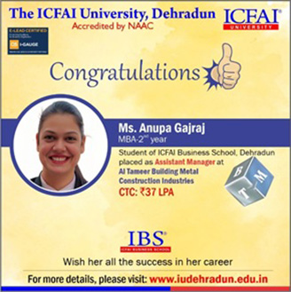 IBS Dehradun is successfully placing its students in eminent organizations since its inception in 2004. The Career Management Center at IBS guides and mentors the students on placement matters. Decisions related to the companies visiting the campus for recruitment are broadly based on parameters such as job profile, growth prospects, remuneration packages and number of students the company intends to select. IBS Dehradun has achieved excellent campus placement for the final year students and summer internship placements, reflecting the faith and confidence of the industry in its students.